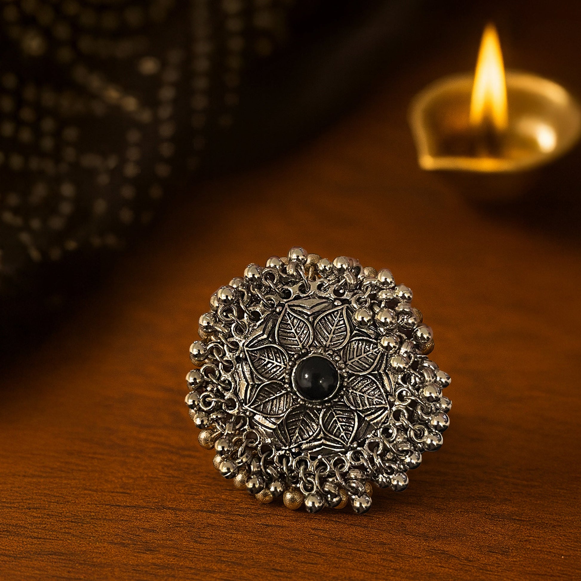 Kalakrith Milano Women oxidised ring features a detailed floral and leaf motif with a black central bead, surrounded by a textured border of tiny metallic drops. Its bold, handcrafted look makes it a standout accessory for ethnic wear. Style it with silver bangles or a statement necklace for a complete festive or boho look.