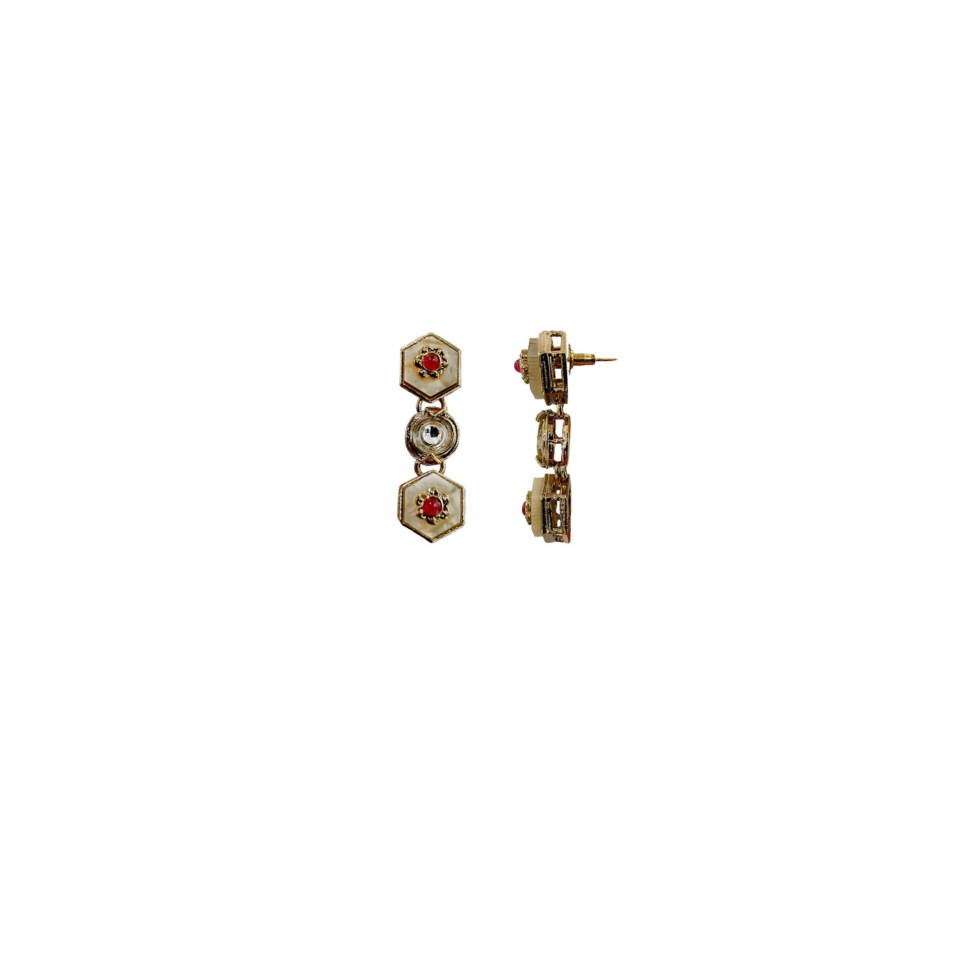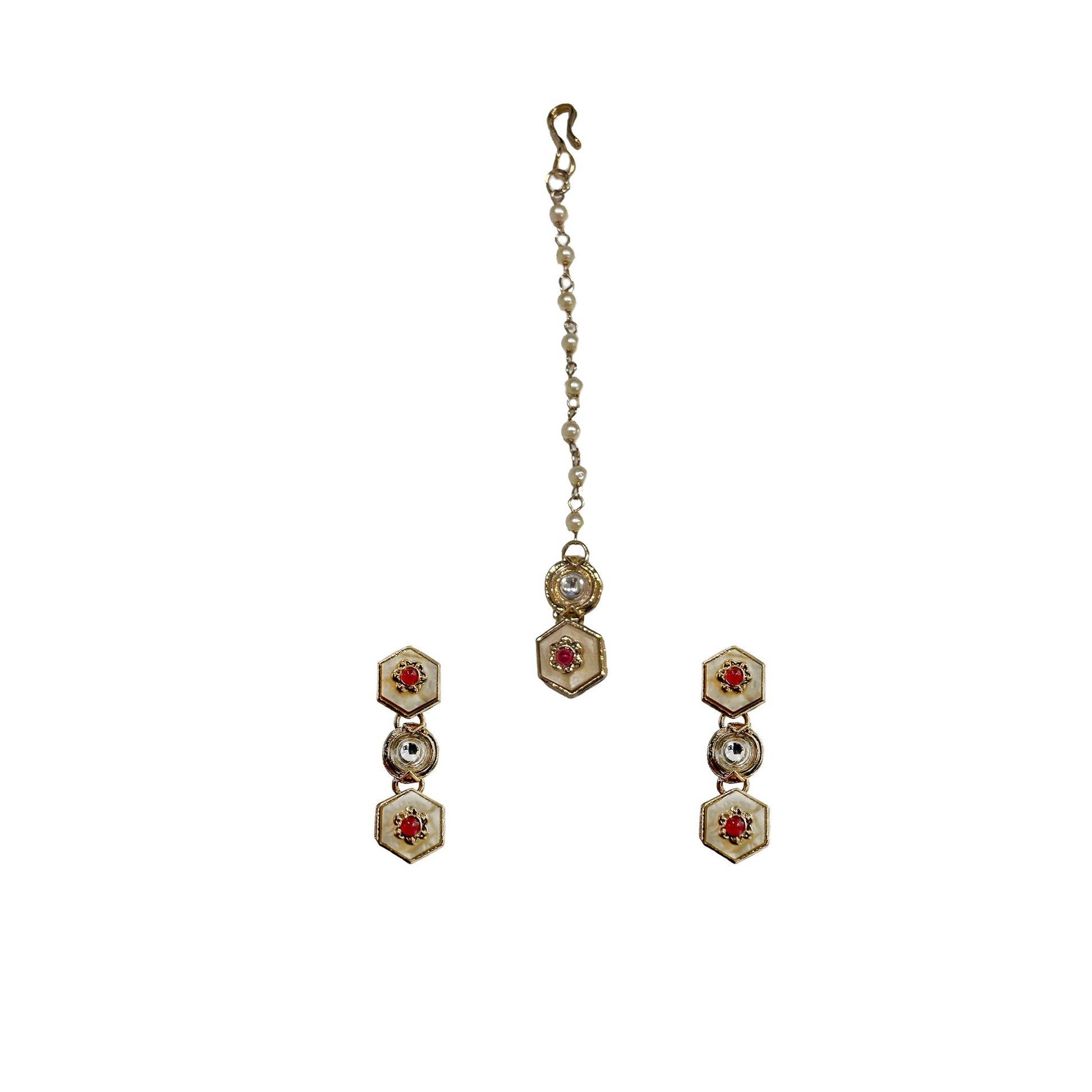 Kalakrith Milano Women elegant choker combines beige hexagonal and round Mother of Pearl stones, each accented with delicate center stones for a refined look. Paired with small danglers and a tiny maangtikka, its subtle design seamlessly complements both western and daytime outfits for versatile wear.