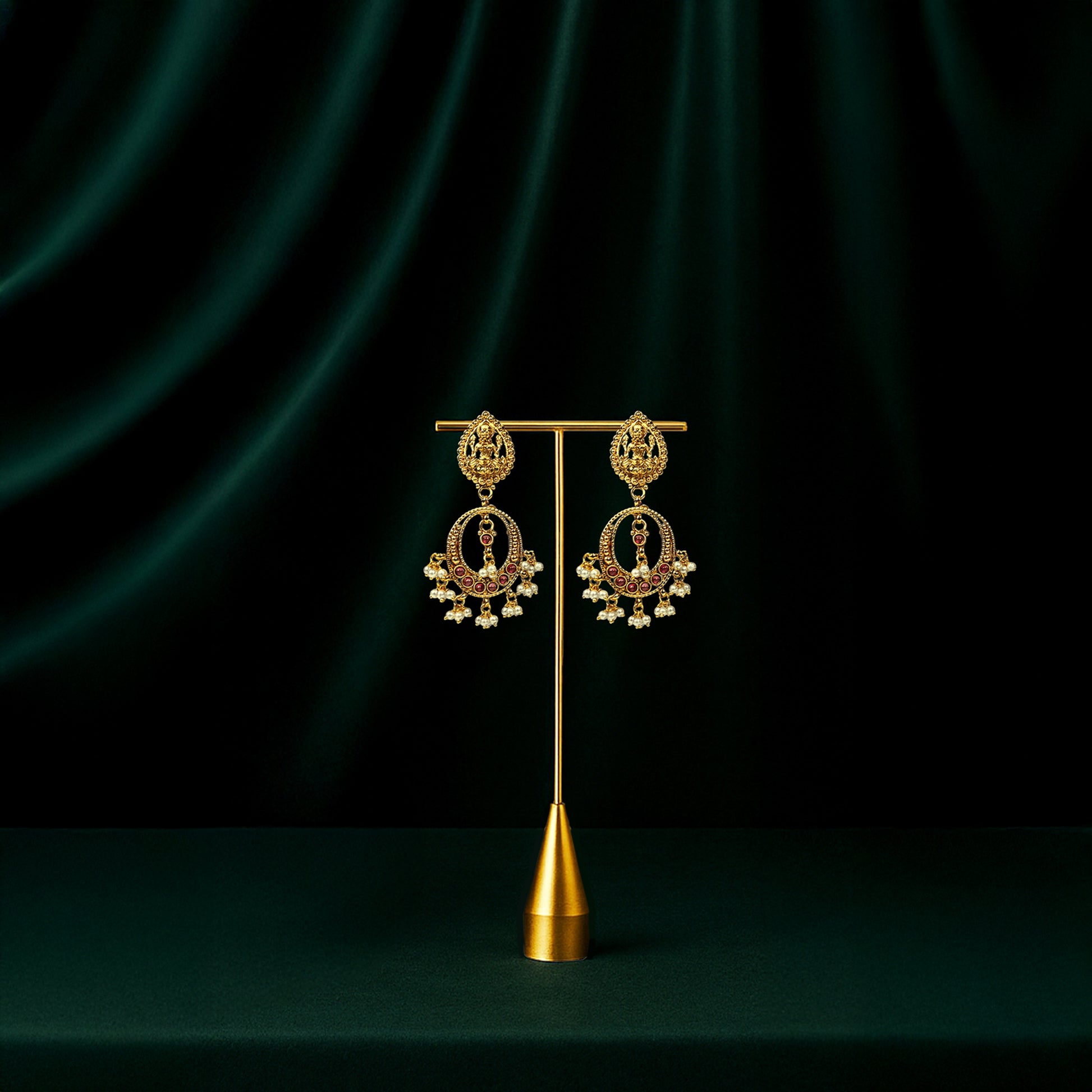Kalakrith Milano Women Embrace grandeur with this four-layered temple necklace, adorned with cluster pearl dangles and bezel-set ruby accents for a regal touch. Its long, cascading silhouette makes a bold statement, paired with chandbali earrings with pearl drops for timeless elegance.
