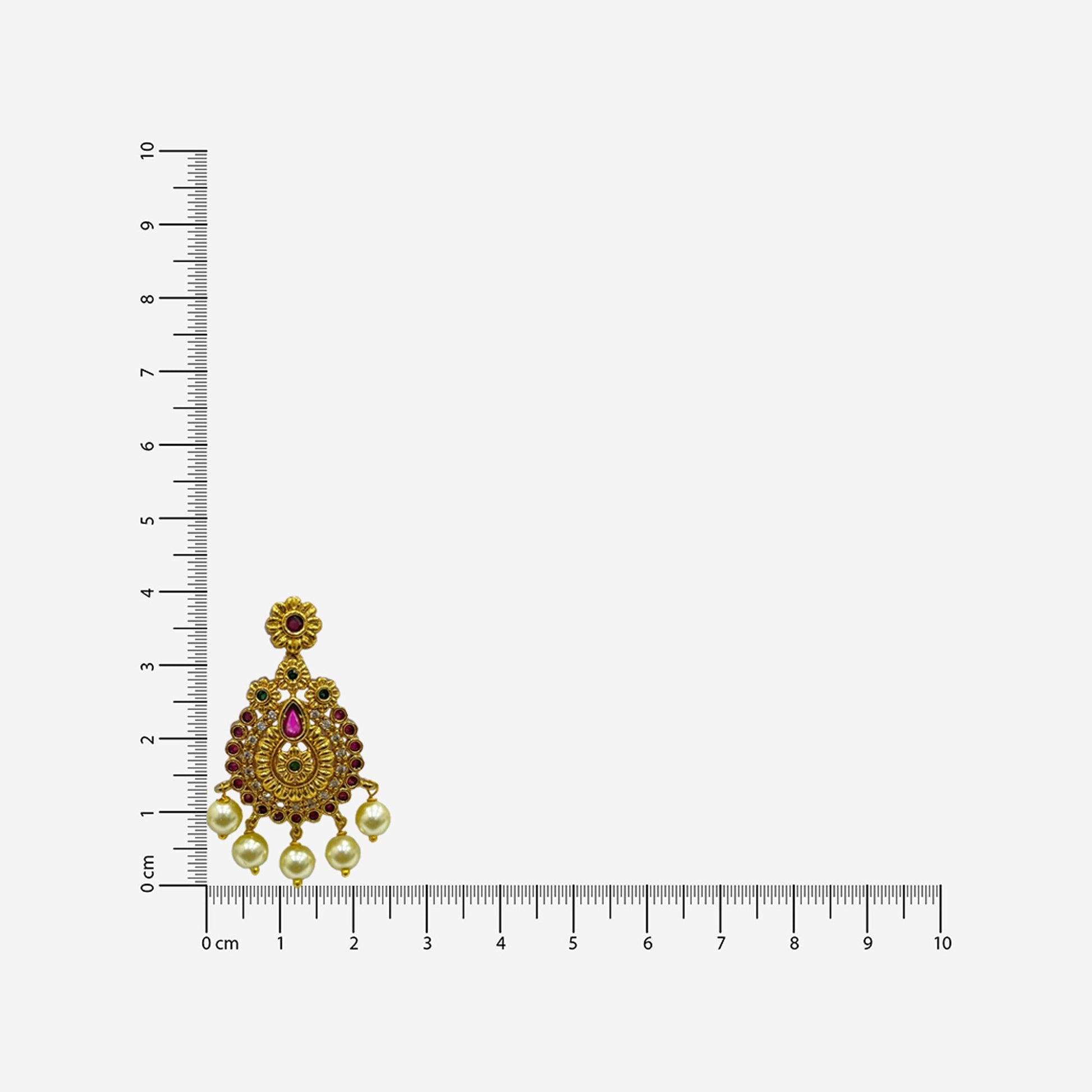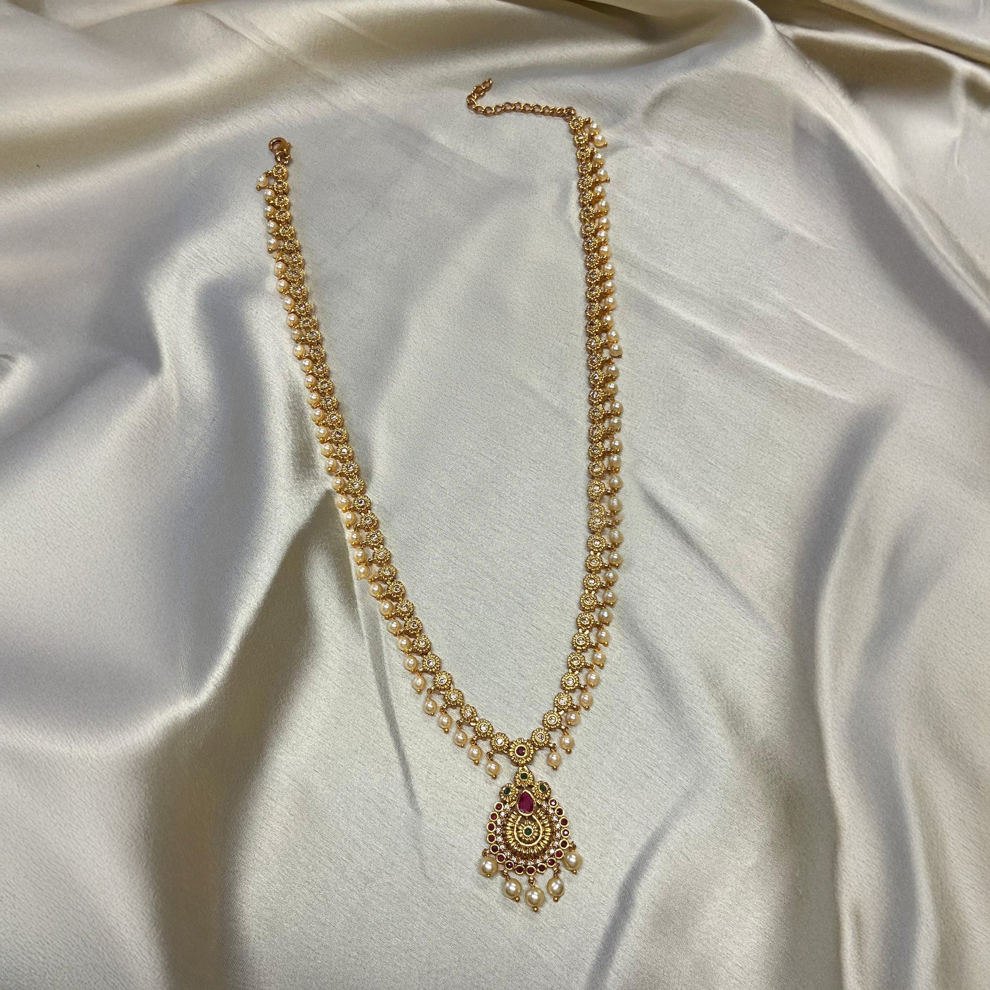 Kalakrith Milano Women delicate graceful necklace features intricate gold floral detailing, accented with tiny pearls and zirconias along the chain. The pendant showcases a teardrop ruby centerpiece, surrounded by ornate goldwork and dangling pearls. A perfect blend of tradition and subtle sophistication, ideal for special occasions.