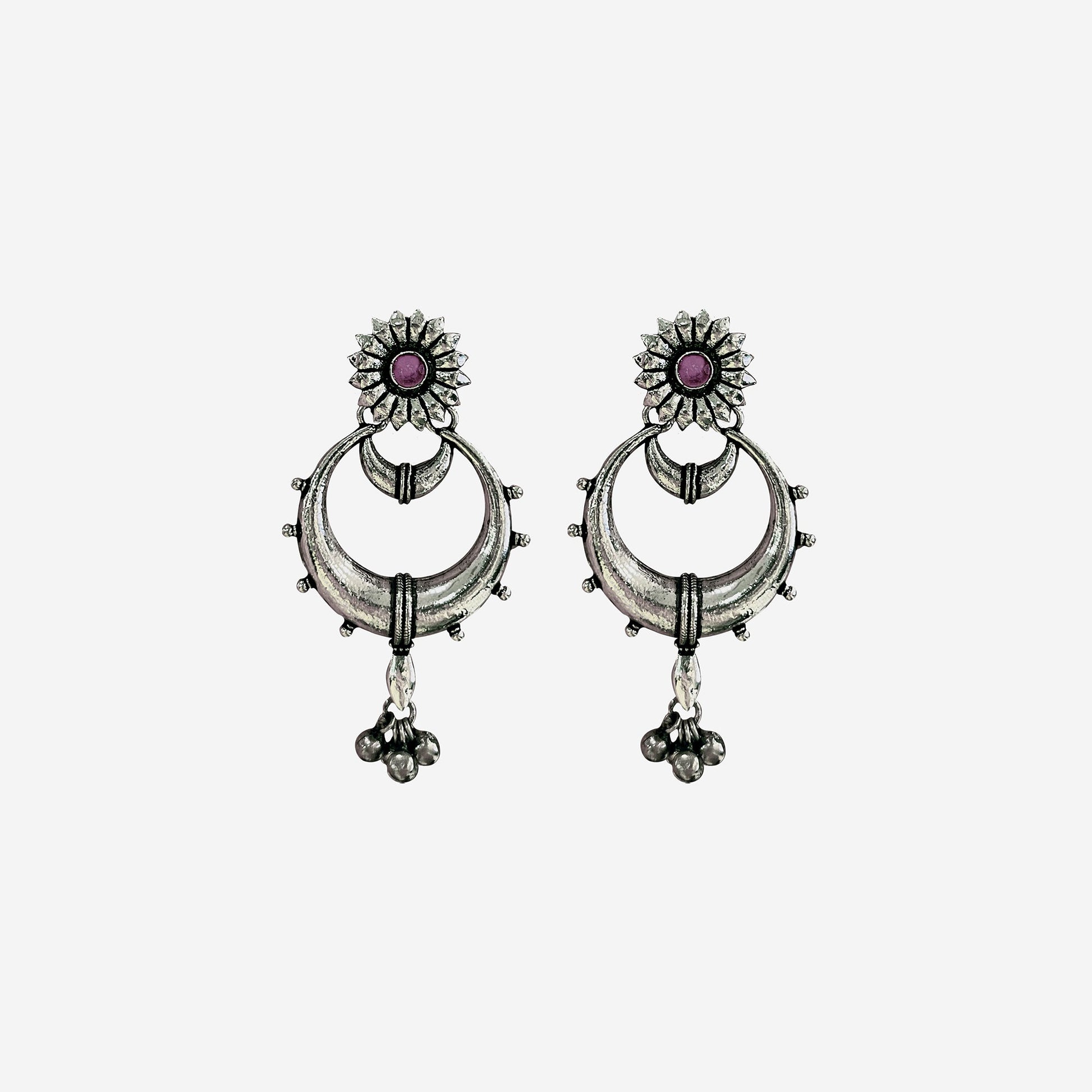 Kalakrith Milano Women Oxidized silver-tone earring with a crescent hoop design, accented by a floral stud and ghungroo-style danglers. The magenta stone adds a pop of color to its antique finish. Complements sarees, suits, or even boho-inspired looks effortlessly.