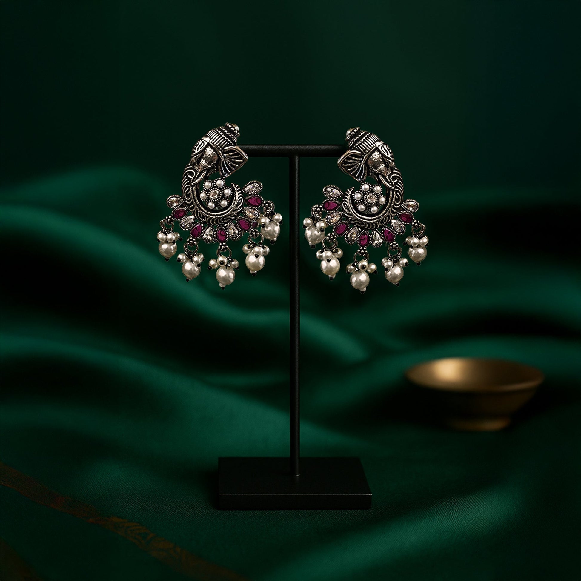 Kalakrith Milano Women oxidised earring features a stylised Ganesha idol at the center, surrounded by magenta stone accents and finished with clusters of white pearl beads. The intricate detailing and layered design give it a rich, traditional appeal. It pairs well with festive or temple wear to enhance the spiritual and ethnic look.