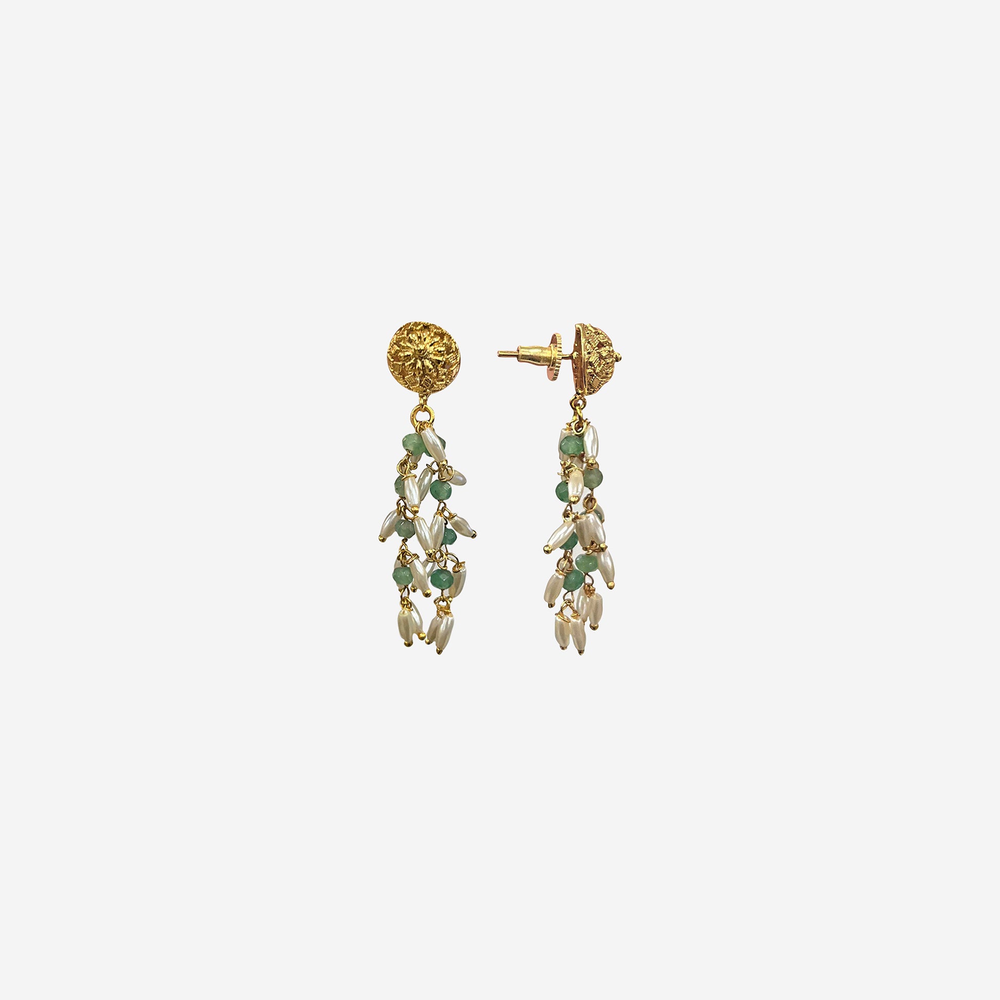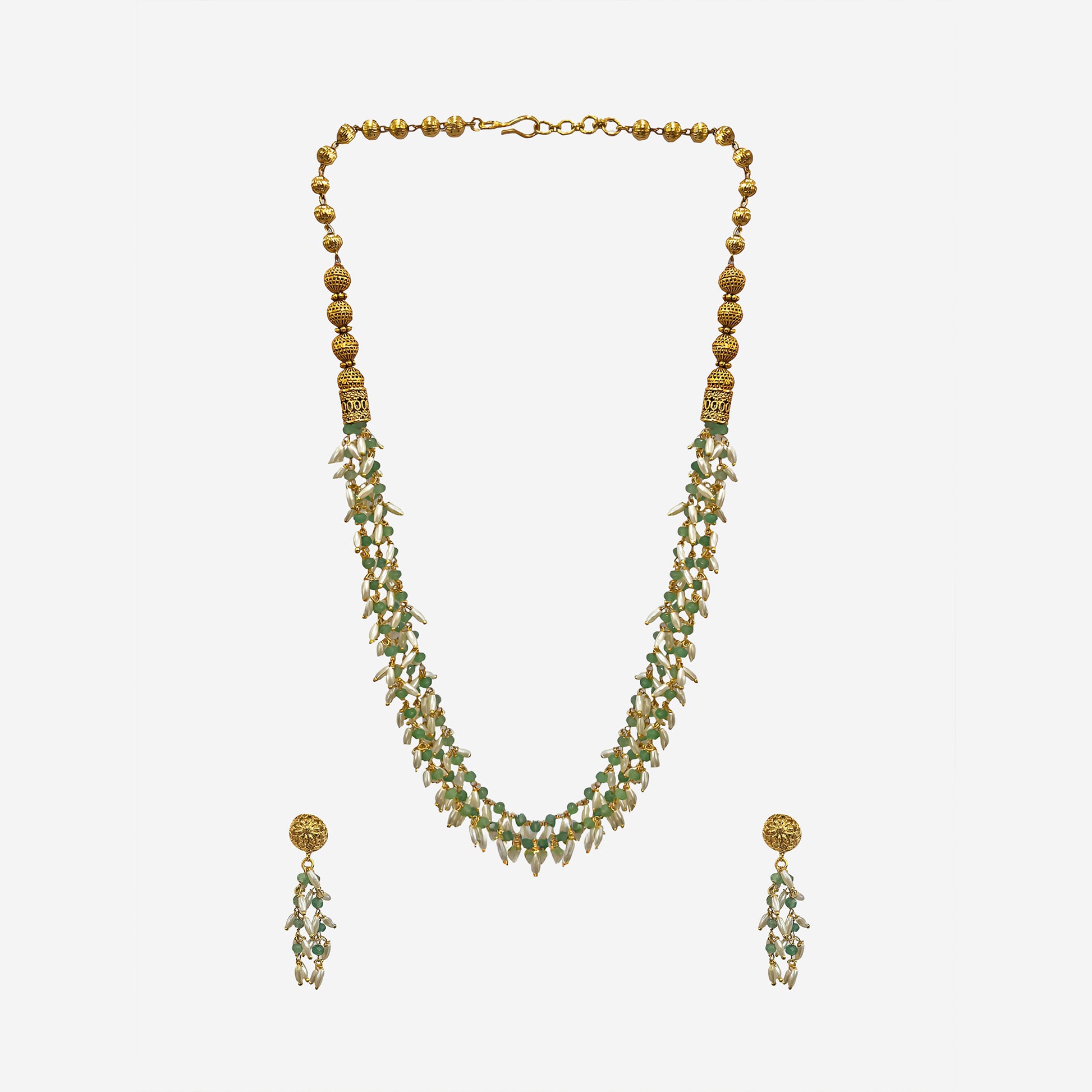 Kalakrith Milano Women long mala features three strands of rice pearls and mint green rice beads seamlessly woven together for a graceful look. Delicate gold filigree beads adorn the ends. Perfectly elegant, it pairs beautifully with a saree for an office look or a party.