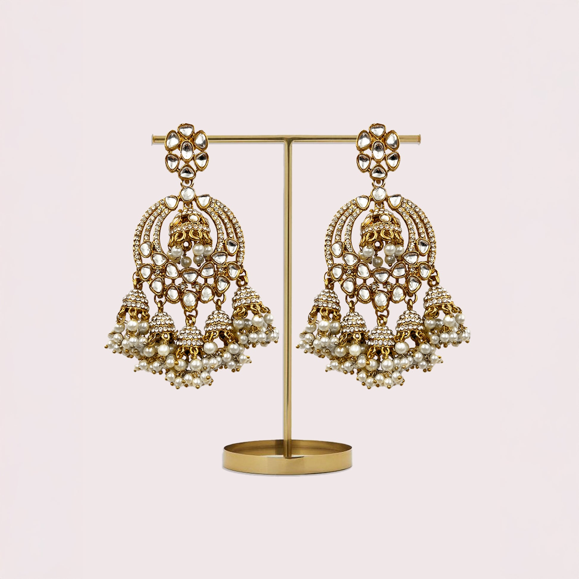 Kalakrith Milano Women White Kundan Studded is a traditional multi-jhumka chandelier earrings feature intricate polki work and delicate flower motifs, exuding timeless elegance and heritage charm