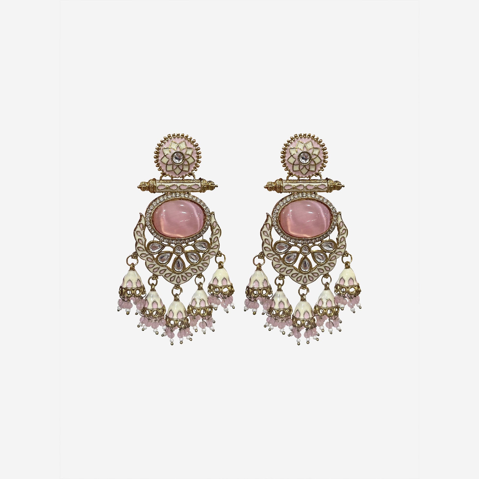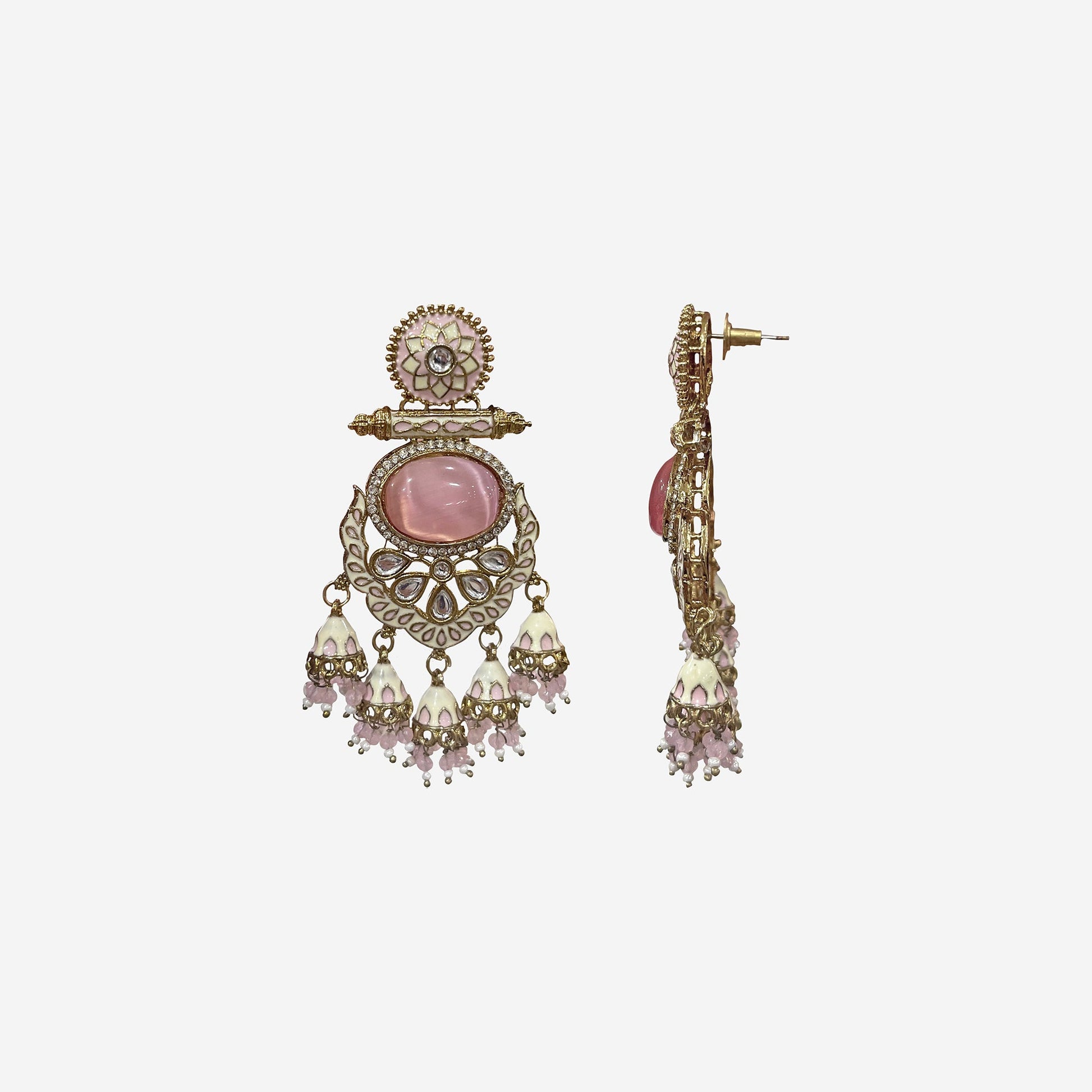 Kalakrith Milano Women enamelled chandelier earrings showcase shades of pink with a transluscent light pink center stone for a soft, elegant touch. Jhumki drops add movement and charm. Perfect to pair with matching outfits for a coordinated statement.